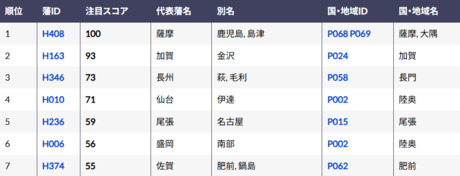 藩IDデータセットは、江戸・明治時代の藩に識別子(ID)を付与するとともに、藩名と別名も定義したデータセットです。また藩に関する独自の情報として、研究論文数に基づく「注目スコア」を追加しています。さらに国・地域IDデータセットも新たに作成し、藩と国を識別子で結合しました。