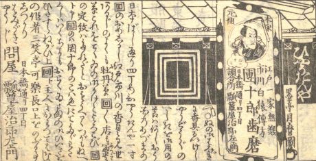 江戸買物案内は、江戸時代に出版された『江戸買物独案内』から広告版面を切り抜くとともに、商人名や職種、居所(住所)、屋号紋などを抽出することで、江戸を中心とする商人に関するビジュアルな商業広告データベースとして構築したものです。